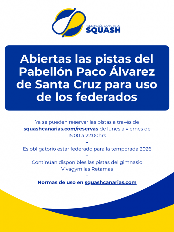«La Federación Canaria de Squash es la entidad responsable de gestionar y organizar todos los torneos oficiales que se celebren en Canarias.
